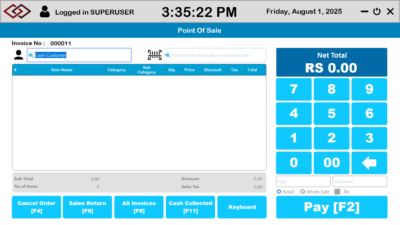 Point of Sale system with inventory management, dynamic cart, Reports, Barcode Scanning and receipt printing.